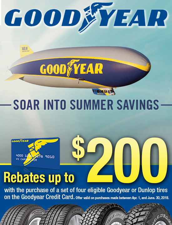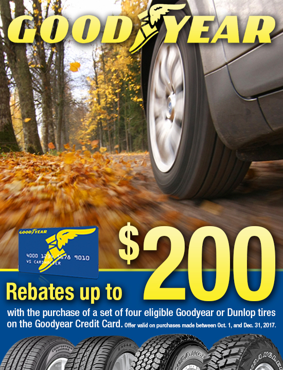 Eligible for $100 mail-in rebate, plus an additional $100 instant rebate when you use your Goodyear Credit Card. $50 rebate for NEW Goodyear credit card accounts(Up to a $250 total rebate)