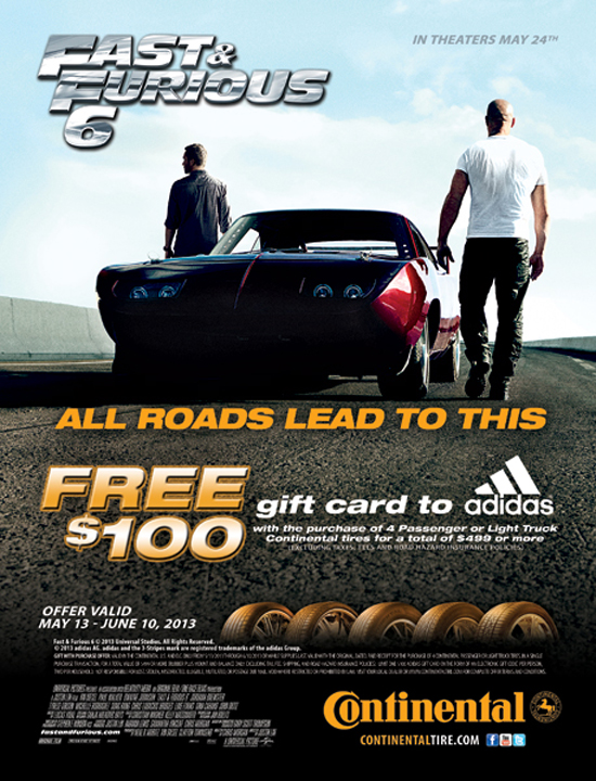 Buy any four (4) Continental brand Passenger or Light Truck Tires for $499 or more and receive a FREE $100 gift card to Adidas (in the form of an electronic gift code)