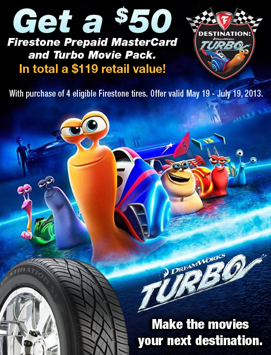 Get rewarded for buying Firestone tires. Get a $50 Firestone Prepaid MasterCard® and Turbo Movie Pack when you buy a set of 4 eligible Firestone tires.