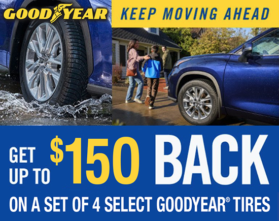 Eligible for a $100 mail-in rebate when you use your Goodyear Credit Card. $50 rebate for NEW Goodyear credit card accounts(Up to $150 total rebate)