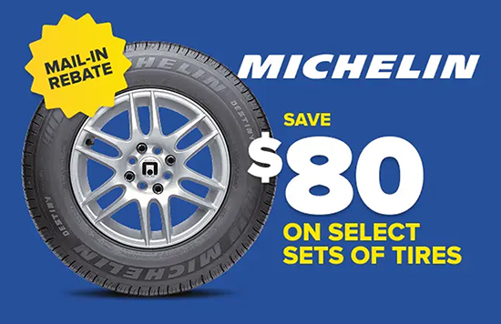 Buy a set of four (4) new qualifying Michelin brand tires between between 9/24/2025 and 12/9/2025 and receive an $80 via Visa® Reward Card or Visa® Virtual Prepaid Card. Submit a copy of your invoice online at TireRewardCenter.com